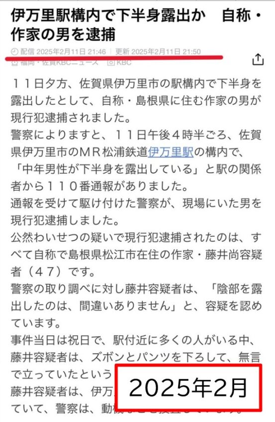 - 2025年2月:佐賀県伊万里市のMR松浦鉄道(伊万里駅)の構内で下半身露出!