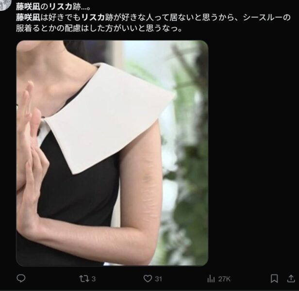 しかし、ネット上では彼女に関する「リスカ痕がある?」「メンヘラなのでは?」といった噂がささやかれています。